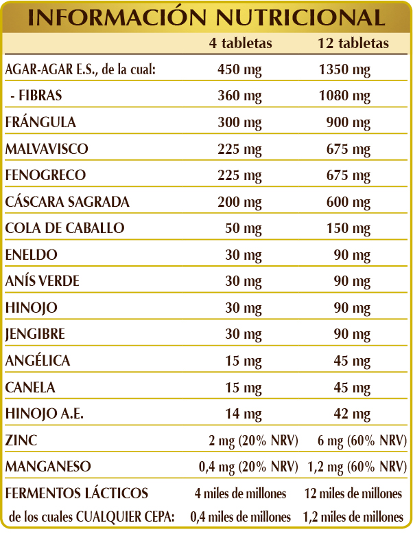 Agar-agar (Gelidium amansii) talo (alga) E.S., frángula (Rhamnus frangula) cortezas Plv, malvavisco (Althaea officinalis) raíces Plv, fenogreco (Trigonella foenum-graecum) semillas Plv, cáscara sagrada (Rhamnus purshiana) cortezas Plv, celulosa microcristalina°, goma arábiga°, cola de caballo (Equisetum arvense) hierba Plv, eneldo (Anethum graveolens) frutos Plv, anís verde (Pimpinella anisum) frutos Plv, hinojo (Foeniculum vulgare) frutos Plv, jengibre (Zingiber officinalis) rizomas Plv, dióxido de silicio°°, mezcla de fermentos lácticos (titulada al 10 % en cada una de las siguientes cepas: Bifidobacterium bifidum SD5215, breve SD5206, lactis SD5219; Lactobacillus acidophilus SD5212, brevis SD5214, bulgaricus SD5589, casei SD5213, paracasei SD5275, plantarum SD5209, rhamnosus SD5217), gluconato de zinc, angélica (Angelica archangelica) raíces Plv, canela (Cinnamomum zeylanicum) cortezas Plv, hinojo (Foeniculum vulgare) frutos A.E., gluconato de manganeso, estearato de magnesio de origen vegetal°°.
