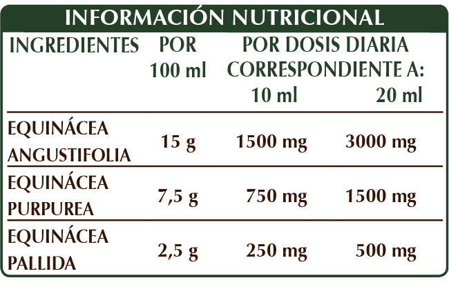Extracto integral líquido sin alcohol obtenido a partir de: glicerina vegetal bidestilada, agua pura, equinácea (Echinacea angustifolia, purpurea y pallida) raíces.
