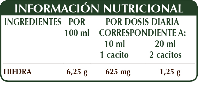 Glicerina vegetal bidestilada, agua pura, hiedra (Hedera helix) hojas E.I.L.