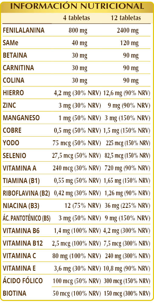 (L-)fenilalanina, celulosa microcristalina°, goma arábiga°, SAMe (S-adenosil metionina tosilato disulfato), vitamina C (ácido ascórbico), bitartrato de colina, gluconato de hierro, (L-)carnitina, betaína, dióxido de silicio°°, gluconato de zinc, vitamina B3 (nicotinamida), estearato de magnesio de origen vegetal°°, gluconato de manganeso, vitamina E de origen natural (acetato de D-α-tocoferol), gluconato de cobre, vitamina B5 (pantotenato de calcio), vitamina B6 (piridoxina), vitamina A (acetato de retinilo), vitamina B1 (tiamina), vitamina B2 (riboflavina), ácido fólico, yoduro de potasio, selenito de sodio, biotina, vitamina B12 (cianocobalamina).