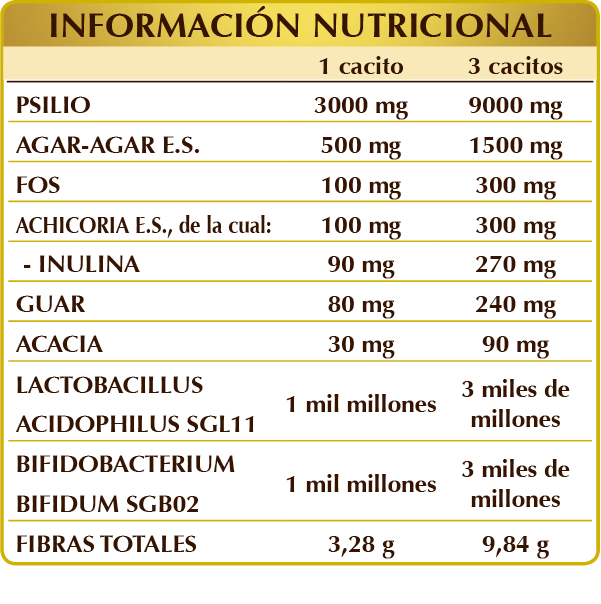 Complemento alimenticio de fibras y fermentos lácticos que ayudan a mantener el equilibrio de la flora bacteriana intestinal. El psilio, el agar-agar y la achicoria favorecen la regularidad intestinal normalizando el volumen y la consistencia de las heces. El psilio, junto al agar-agar y la goma guar, modula la absorción de los nutrientes, mientras que, en combinación con la acacia, ejerce una acción emoliente y lenitiva en todo el aparato digestivo y facilita el metabolismo de los carbohidratos. Por último, la goma guar estimula la sensación de saciedad.
