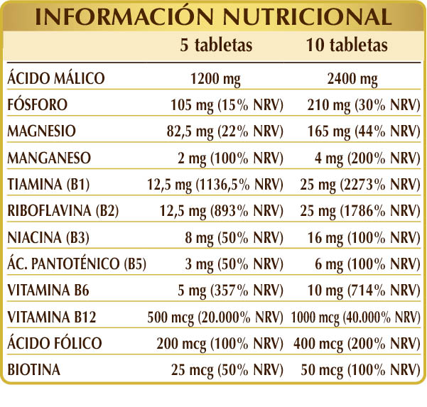 Suplemento de ácido málico, enriquecido con minerales y vitaminas. El magnesio favorece el funcionamiento normal de los músculos, contribuye a la síntesis normal de proteínas y junto con el fósforo y el manganeso favorece el mantenimiento de la salud ósea; además, con vitamina B12 y ácido fólico interviene en el proceso de división celular, con vitaminas B1, B2, B3, B6, B12 y biotina apoya el funcionamiento del sistema nervioso y con vitaminas B2, B3, B5, B6, B12. y ácido fólico ayuda a reducir el cansancio y la fatiga. Finalmente, el manganeso contribuye a la formación normal de los tejidos conectivos mientras que con el magnesio, el fósforo, la vitamina B1, B2, B3, B5, B6, B12 y la biotina favorece el metabolismo energético normal.