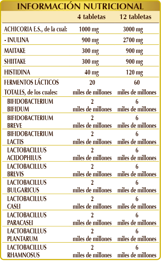 Achicoria (Cichorium intybus) raíces E.S. (titulado al 90 % en inulina), maitake (Grifola frondosa) esporóforo (hongo) polvo, shiitake (Lentinula edodes) esporóforo (hongo) polvo, mezcla de fermentos lácticos (titulada al 10 % en cada una de las siguientes cepas: Bifidobacterium bifidum SD5215, breve SD5206, lactis SD5219; Lactobacillus acidophilus SD5212, brevis SD5214, bulgaricus SD5589, casei SD5213, paracasei SD5275, plantarum SD5209, rhamnosus SD5217), celulosa microcristalina°, goma arábiga°, (L-)histidina, dióxido de silicio°°, estearato de magnesio de origen vegetal°°. °Agente de carga. °°Antiaglomerante.