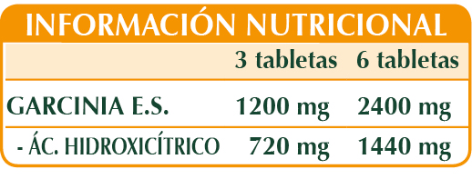 Garcinia (Garcinia cambogia) frutos E.S. (estandarizado al 60 % en HCA o ácido hidroxicítrico), celulosa microcristalina°, goma arábiga°, dióxido de silicio°°, estearato de magnesio de origen vegetal°°.