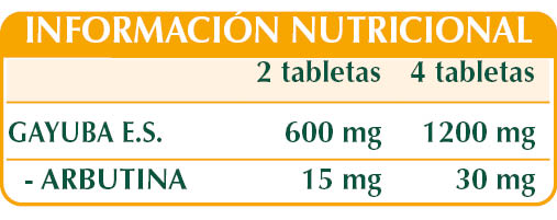 Gayuba (Arctostaphylos uva-ursi) hojas E.S. (estandarizado al 20% en arbutina), celulosa microcristalina°, goma arábiga°, maltodextrinas de maíz o arroz, dióxido de silicio°°, estearato de magnesio de origen vegetal°°.