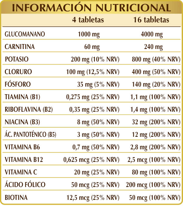Complemento alimenticio coadyuvante en dietas hipocalóricas para la reducción del peso corporal. El glucomanano contribuye a la pérdida de peso* y favorece el mantenimiento de niveles normales de colesterol en sangre**. El fósforo, las vitaminas B1, B2, B3, B5, B6, B12, C y la biotina favorecen el metabolismo energético.