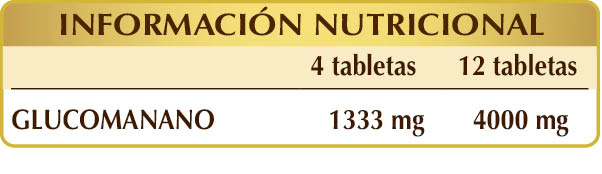 Efectos beneficiosos que se pueden obtener, según las formas de uso indicadas, tomando: *al menos 3 g de glucomanano al día en tres tomas de 1 g cada una en el contexto de una dieta hipocalórica. **4 g de glucomanano al día.