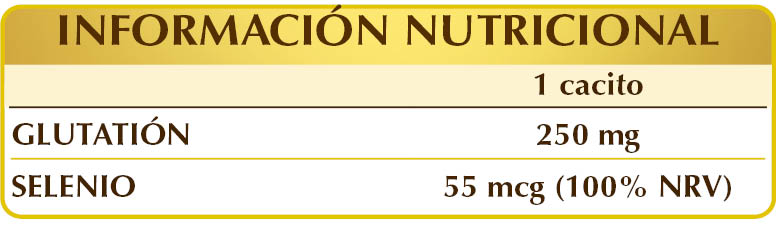 Complemento alimenticio de glutatión y selenio. El selenio, en particular, ayuda a proteger las células contra el estrés oxidativo, promueve el correcto funcionamiento de la tiroides y del sistema inmunitario, favorece la espermatogénesis y contribuye a mantener la salud de las uñas y del cabello.