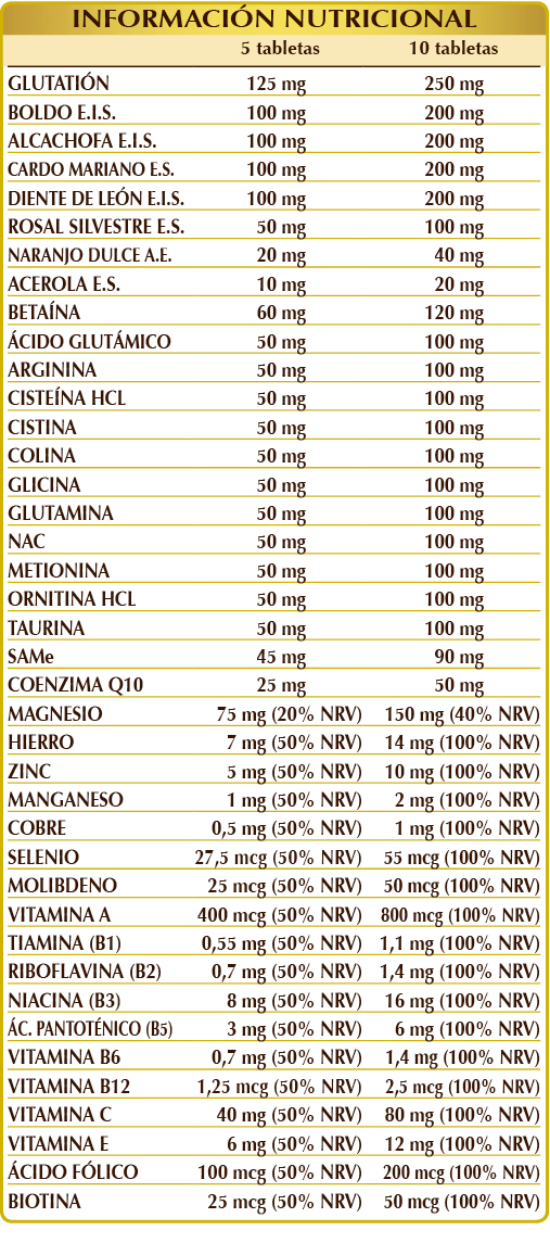 Celulosa microcristalina°, goma arábiga°, glutatión reducido, óxido de magnesio, tartrato de colina, boldo (Peumus boldus) hojas E.I.S., alcachofa (Cynara scolymus) hojas E.I.S., cardo mariano (Silybum marianum) frutos E.S. (estandarizado al 80 % en silimarina), diente de león (Taraxacum officinale) raíces E.I.S., dióxido de silicio°°, SAMe (S-adenosil metionina tosilato de disulfato), gluconato de hierro, betaína, ácido (L-)glutámico, (L-)arginina, (L-)cisteína HCL o clorhidrato, (L-)cistina, glicina, (L-)glutamina, NAC (N-acetilcisteína), (L-)metionina, (L-)ornitina HCL o clorhidrato, rosal silvestre (Rosa canina) frutos E.S. (estandarizado al 70 % en vitamina C), taurina, gluconato de zinc, coenzima Q10; aroma natural: naranjo dulce (Citrus aurantium var. sinensis o dulcis) cáscaras de los frutos A.E.; vitamina E de origen vegetal (acetato de D-α-tocoferol), estearato de magnesio de origen vegetal°°, acerola (Malpighia glabra) frutos E.S. (estandarizado al 50% en vitamina C), vitamina B3 (nicotinamida), gluconato de manganeso, gluconato de cobre, vitamina B5 (pantotenato de calcio), vitamina A (acetato de retinilo), vitamina B2 activada (riboflavina 5-fosfato de sodio), vitamina B6 activada (piridoxal 5-fosfato), vitamina B1 (clorhidrato de tiamina), ácido fólico activado (L-metilfolato de calcio), molibdato de sodio, selenito de sodio, biotina, vitamina B12 activada (5-desoxiadenosilcobalamina, metilcobalamina). °Agente de carga. °°Antiaglomerante