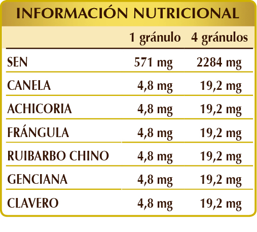 El sen, la achicoria, la frángula y el ruibarbo ayudan a regular el tránsito intestinal. La canela, el clavero y la genciana contribuyen a la eliminación de los gases intestinales y promueven la función digestiva.