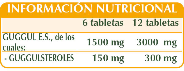 Guggul (Commiphora mukul) gomorresina E.S. (estandarizado al 10 % en guggulsteroles), celulosa microcristalina°, goma arábiga°, maltodextrinas de maíz o arroz, dióxido de silicio°°, estearato de magnesio de origen vegetal°°. °Agente de carga. °°Antiaglomerante