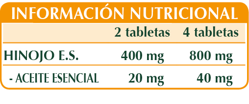 Hinojo (Foeniculum vulgare) frutos E.S. (titulado al 5 % en aceite esencial), celulosa microcristalina°, goma arábiga°, maltodextrinas de maíz o arroz, dióxido de silicio°°, estearato de magnesio de origen vegetal°°.