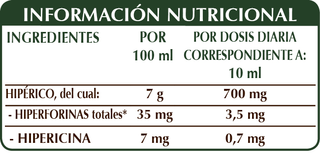 Extracto integral líquido sin alcohol obtenido a partir de: glicerina vegetal bidestilada, agua pura, hipérico (Hypericum perforatum) hierba con flores.