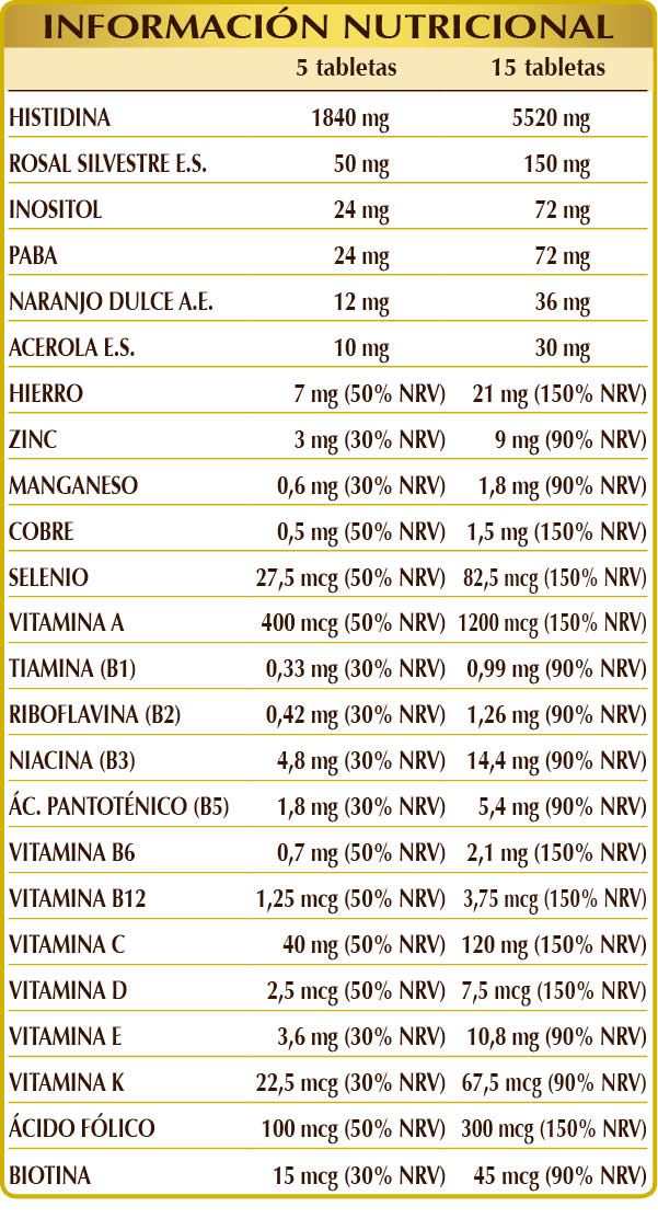 Complemento alimenticio a base de histidina, sales minerales, vitaminas y otros nutrientes. El hierro, el zinc, el cobre, el selenio, las vitaminas A, B6, B12, C y C y el ácido fólico contribuyen al correcto funcionamiento del sistema inmunitario.