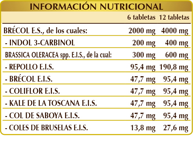 Brécol (Brassica oleracea var. italica) hierba con flores E.S. (titulado al 10 % en indol 3-carbinol), celulosa microcristalina°, goma arábiga°, repollo (Brassica oleracea var. capitata) hojas E.I.S., brécol (Brassica oleracea var. italica) hierba con flores E.I.S., coliflor (Brassica oleracea var. botrytis) hierba con flores E.I.S., kale de la Toscana (Brassica oleracea var. acephala) hojas E.I.S., col de Saboya (Brassica oleracea var. sabauda) hojas E.I.S., dióxido de silicio°°, coles de Bruselas (Brassica oleracea var. gemmifera) hojas E.I.S., estearato de magnesio de origen vegetal°°. °Agente de carga. °°Antiaglomerante.