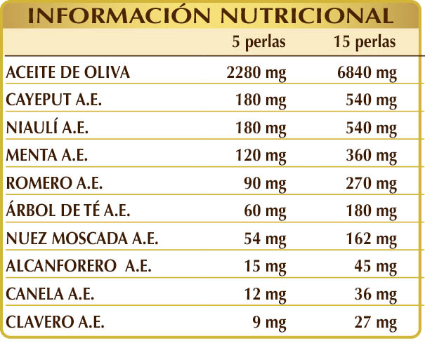 Aceite virgen extra de olivas sin hueso, cayeput (Melaleuca leucadendron var. cajaputi) hojas A.E., niaulí (Melaleuca leucadendron var. viridiflora) hojas A.E., menta piperita (Mentha piperita) hojas A.E., romero (Rosmarinus officinalis) sumidades floridas A.E., árbol de té (Melaleuca alternifolia) hojas A.E., nuez moscada (Myristica fragrans) frutos (nueces) A.E., alcanforero (Cinnamomum camphora) cortezas A.E., canela (Cinnamomum zeylanicum) cortezas A.E., clavero (Eugenia caryophyllata) yemas florales A.E.; excipientes (perlas): gelatina alimentaria y glicerina.