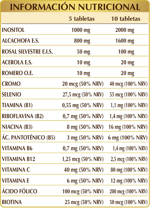 Complemento alimenticio a base de inositol, hierbas, sales minerales y vitaminas. La alcachofa favorece las funciones depurativas del organismo y, junto al romero, estimula las funciones depurativas y ejerce una beneficiosa acción antioxidante. El selenio y las vitaminas B2, C y E son útiles para proteger las células contra el estrés oxidativo.