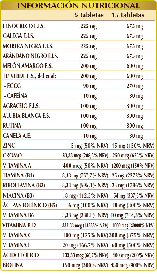 Fenogreco (Trigonella foenum-graecum) semillas E.I.S., galega (Galega officinalis) hierba con flores E.I.S., morera negra (Morus nigra) hojas E.I.S., arándano negro (Vaccinium myrtillus) hojas E.I.S., melón amargo (Momordica charantia) frutos E.S. (estandarizado al 10 % en charantina), té verde (Camellia sinensis) hojas E.S. (estandarizado al 98 % en polifenoles, de los cuales un 45 % de galato de epigalocatequina o EGCG), celulosa microcristalina°, goma arábiga°, agracejo (Berberis vulgaris) cortezas de las raíces E.I.S., alubia blanca (Phaseolus vulgaris) semillas E.S., rutina, vitamina C (ácido ascórbico), dióxido de silicio°°, vitamina E de origen vegetal (acetato de D-α-tocoferol), gluconato de zinc, estearato de magnesio de origen vegetal°°, vitamina B3 (nicotinamida), vitamina B2 activada (riboflavina 5-fosfato de sodio), vitamina B1 (clorhidrato de tiamina), canela (Cinnamomum zeylanicum) cortezas A.E., vitamina B5 (pantotenato de calcio), vitamina B6 activada (piridoxal-5-fosfato), vitamina A (acetato de retinol), picolinato de cromo, vitamina B12 activada (5-desoxiadenosilcobalamina, metilcobalamina), biotina, ácido fólico. °Agente de carga °°Antiaglomerante