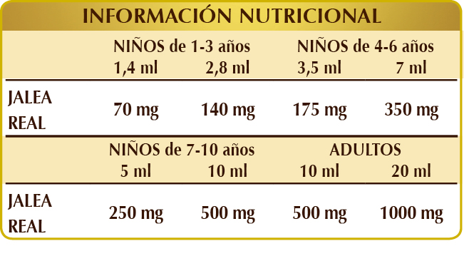 Complemento alimenticio a base de jalea real fresca específicamente estudiado para niños de 1 a 10 años y para adultos. La jalea real, producida por las abejas obreras, es un “superalimento” altamente nutritivo utilizado por las abejas para alimentar a las larvas hasta los tres días de edad y a la abeja reina durante toda su larga vida.
