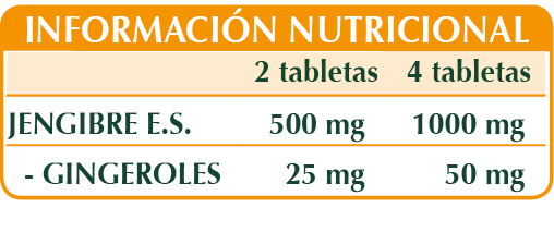 Jengibre (Zingiber officinalis) rizomas E.S. (titulado al 5 % en gingeroles), maltodextrinas de maíz o arroz, celulosa microcristalina°, goma arábiga°, dióxido de silicio°°, estearato de magnesio de origen vegetal°°.