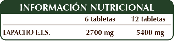 Lapacho (Tecoma curialis o Tabebuia avellanedae) cortezas E.I.S., celulosa microcristalina°, goma arábiga°, dióxido de silicio°°, estearato de magnesio de origen vegetal°°.