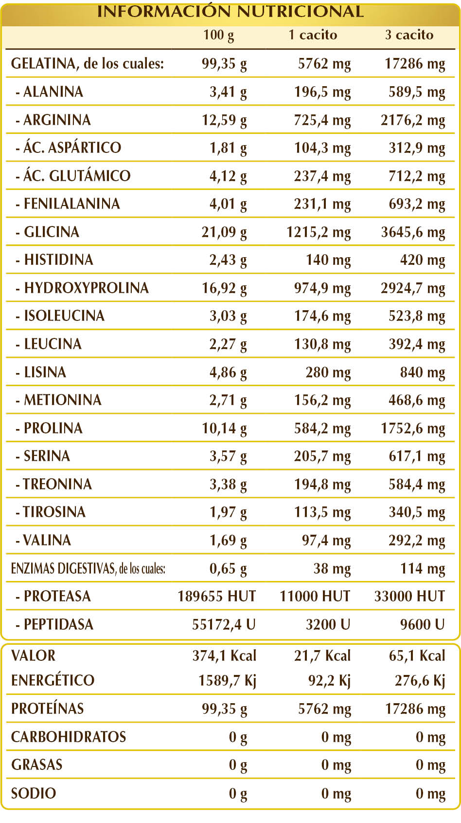 Gelatina alimentaria (de piel bovina), proteasa (500.000 HUT/g) de origen vegetal (Aspergillus oryzae), peptidasa (200.000 U/g).