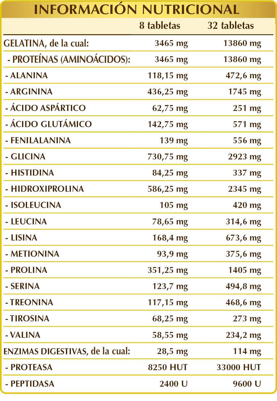 Complemento alimenticio a base de gelatina bovina que proporciona proteínas útiles para el mantenimiento normal de los huesos y para el crecimiento de la masa muscular. CON ENZIMAS DIGESTIVAS