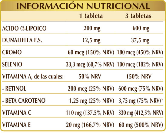 Complemento alimenticio a base de ácido lipoico, sales minerales y vitaminas. Las vitaminas C y E y el selenio contribuyen a la protección de las células contra el estrés oxidativo. La vitamina A interviene en el proceso de especialización celular y, junto con la Dunaliella, promueve el mantenimiento de la capacidad visual. El cromo favorece el mantenimiento de unos niveles de glucosa en sangre normales.