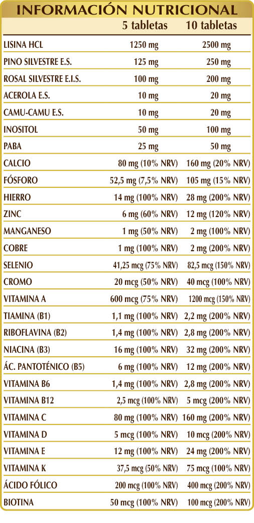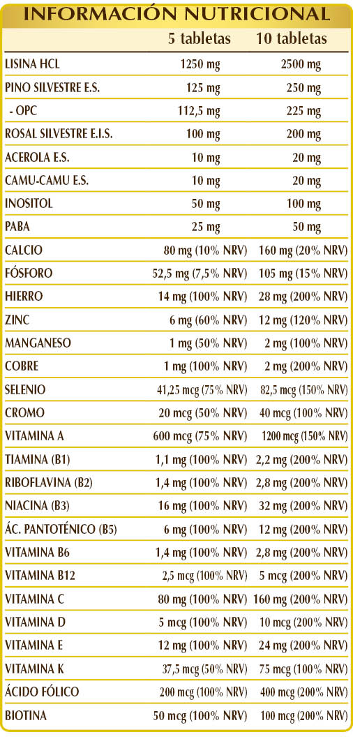 (L-)lisina HCL o clorhidrato, fosfato cálcico dibásico, pino silvestre (Pinus sylvestris) cortezas E.S. (estandarizado al 90 % en proantocianidinas oligoméricas o OPC), celulosa microcristalina°, goma arábiga°, rosal silvestre (Rosa canina) frutos E.I.S. (estandarizado al 70 % en vitamina C), citrato férrico de amonio, mio-inositol de origen vegetal (extraído de semillas de maíz), dióxido de silicio°°, gluconato de zinc, carbonato cálcico, vitamina E de origen vegetal (acetato de D-α-tocoferol), PABA (ácido p-aminobenzoico), vitamina B3 (nicotinamida), estearato de magnesio de origen vegetal°°, acerola (Malpighia glabra) frutos E.S. (estandarizado al 50 % en vitamina C), camu-camu (Myrciaria dubia) frutos E.S. (titulado al 50 % en vitamina C), gluconato de manganeso, gluconato de cobre, vitamina B5 (pantotenato de calcio), vitamina A (acetato de retinilo), vitamina B2 activada (riboflavina 5-fosfato de sodio), vitamina B6 activada (piridoxal-5-fosfato), líquen (Cladonia rangiferina) talo E.S. (titulado en vitamina D3 colecalciferol 100 000 UI/g), vitamina B1 (clorhidrato de tiamina), ácido fólico activado (L-metilfolato de calcio), cromo picolinato, selenito de sodio, vitamina K1 (filoquinona), biotina, vitamina B12 activada (5-deoxiadenosilcobalamina, metilcobalamina). .°Agente de carga. °°Antiaglomerante