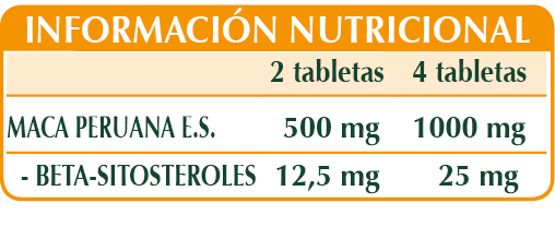 Maca (Lepidium meyenii) raíces E.S. (estandarizado al 2,5 % en beta-sitosteroles), maltodextrinas de maíz o arroz, celulosa microcristalina°, goma arábiga°, dióxido de silicio°°, estearato de magnesio de origen vegetal°°.