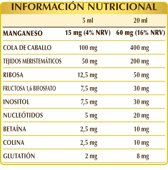 Glicerina vegetal bidestilada, agua pura, citrato de magnesio; macerado glicerinado de tejidos meristemáticos frescos: espino blanco (Crataegus oxyacantha, sinónimo Crataegus laevigata) jóvenes brotes, frambueso (Rubus idaeus) jóvenes brotes, cornejo (Cornus sanguinea) yemas, endrino (Prunus spinosa) yemas; gluconato de magnesio, pidolato de magnesio, ribosa, fructosa 1,6-bifosfato, inositol, citrato de betaína, tartrato de colina; mezcla de nucleótidos: AMP (monofosfato de adenosina), CMP (monofosfato de citosina), GMP (monofosfato de guanosina), UMP (monofosfato de uridina); glutatión reducido; edulcorante de origen natural: taumatina. Con edulcorantes de origen natural.