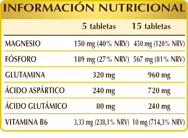 Complemento alimenticio a base de magnesio y aminoácidos. El magnesio interviene en los procesos de división celular y puede favorecer el equilibrio electrolítico, la síntesis proteica y la función muscular. Junto a la vitamina B6, contribuye al buen funcionamiento del sistema nervioso y de las funciones psicológicas, promueve el metabolismo energético y ayuda a combatir el cansancio y la fatiga. Además, junto al fósforo, mantiene el bienestar de los huesos y los dientes.