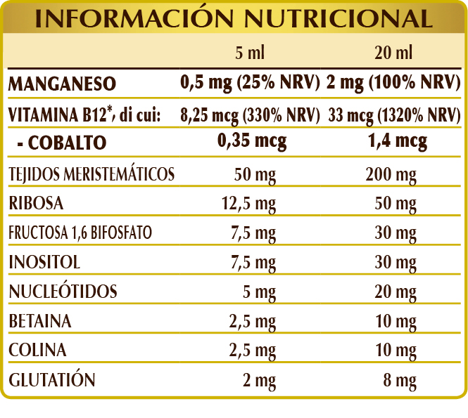 Glicerina vegetal bidestilada, agua pura; macerado glicerinado de tejidos meristemáticos frescos (1 %): castaño (Castanea vesca, sinónimo Castanea sativa) yemas, castaño de Indias (Aesculus hippocastanum) yemas (libres de escina), álamo negro (Populus nigra) yemas; ribosa, fructosa 1,6-bifosfato; corrector de acidez: ácido cítrico; inositol, citrato de betaína, tartrato de colina; mezcla de nucleótidos: AMP (adenosina monofosfato), CMP (citosina monofosfato), GMP (guanosina monofosfato), UMP (uridina monofosfato); gluconato de manganeso, glutatión reducido; edulcorante de origen natural: taumatina; vitamina B12 activada (5-desoxiadenosilcobalamina, metilcobalamina). Con edulcorantes de origen natural.