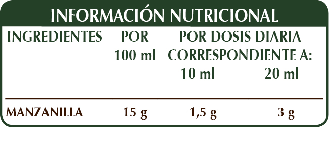 Extracto integral líquido sin alcohol obtenido a partir de: glicerina vegetal bidestilada, agua pura, manzanilla vulgar (Matricaria chamomilla) cabezuelas (flores).
