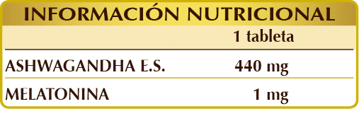 Ashwagandha (Withania somnifera) raíces E.S. (estandarizado al 2,5 % en withanólidos), celulosa microcristalina°, goma arábiga°, dióxido de silicio°°, estearato de magnesio de origen vegetal°°, melatonina.