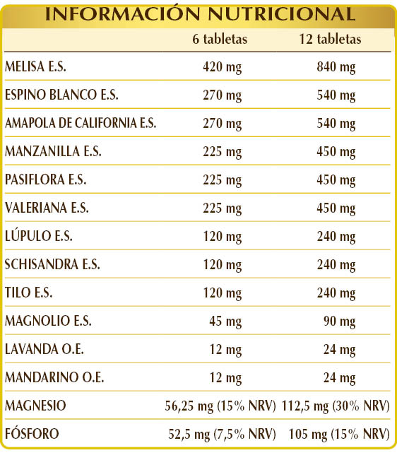 Melisa (Melissa officinalis) hojas E.S. (titulado al 2 % en ácido rosmarínico), glicerofosfato de magnesio, celulosa microcristalina°, espino blanco (Crataegus oxyacantha) flores y hojas E.S. (titulado al 1 % en flavonoides), amapola de California (Eschscholzia californica) hierba E.S. (titulado al 0,3 % en protopina), manzanilla vulgar (Matricaria chamomilla) cálices (flores) E.S. (titulado al 0,2 % en apigenina), pasiflora (Passiflora incarnata) hierba con flores E.S. (titulado al 2,5 % en vitexina), valeriana (Valeriana officinalis) raíces E.S. (titulado al 0,8 % en ácido valérico), dióxido de silicio°°, lúpulo (Humulus lupulus) estróbilos (flores hembra) E.S. (titulado al 0,4% en rutina), schisandra (Schisandra chinensis) frutos E.S. (titulado al 5% en schisandrinas), tilo (Tilia platyphyllos) flores E.S. (titulado al 1% en flavonoides), goma arábiga°, magnolio (Magnolia officinalis) cortezas E.S. (titulado al 90 % en magnolol y honokiol), óxido de magnesio, estearato de magnesio de origen vegetal°°, lavanda (Lavandula officinalis) sumidades floridas A.E., mandarino (Citrus reticulata) cáscaras de los frutos A.E.