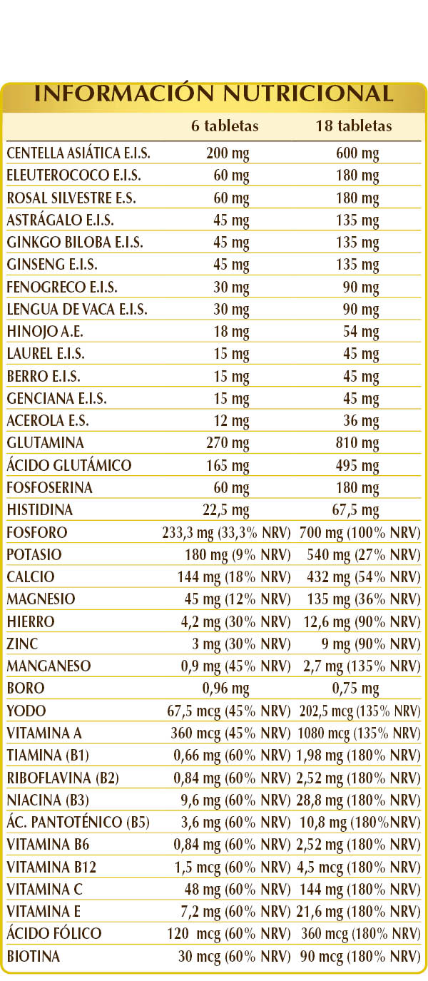 Fosfato cálcico dibásico, fosfato potásico dibásico, glicerofosfato de magnesio, (L-)glutamina, glicerofosfato de calcio, celulosa microcristalina°, goma arábiga°, centella asiática (Centella asiatica) hierba E.I.S., ácido (L-)glutámico, dióxido de silicio°°, eleuterococo (Eleutherococcus senticosus) raíces E.I.S., (DL-)fosfoserina, rosal silvestre (Rosa canina) frutos E.S. (estandarizado al 70 % en vitamina C), astrágalo (Astragalus membranaceus) raíces E.I.S, ginkgo biloba (Ginkgo biloba) hojas E.I.S., ginseng (Panax ginseng) raíces E.I.S., fenogreco (Trigonella foenum-graecum) semillas E.I.S., lengua de vaca (Rumex crispus) raíces E.I.S., citrato férrico de amonio, (L-)histidina, gluconato de zinc, óxido de magnesio, hinojo (Foeniculum vulgare) frutos A.E., vitamina E de origen vegetal (acetato de D-α-tocoferol), laurel (Laurus nobilis) hojas E.I.S., berro (Nasturtium officinale) hierba E.I.S., genciana (Genziana lutea) raíces E.I.S., estearato de magnesio de origen vegetal°°, acerola (Malpighia glabra) frutos E.S. (estandarizado al 50% en vitamina C), vitamina B3 (nicotinamida), gluconato de manganeso, vitamina B5 (pantotenato de calcio), vitamina A (acetato de retinilo), vitamina B2 activada (riboflavina 5-fosfato de sodio), vitamina B6 activada (piridoxal 5-fosfato), vitamina B1 (clorhidrato de tiamina), ácido fólico activado (L-metilfolato de calcio), yoduro de potasio, biotina, vitamina B12 activada (5-desoxiadenosilcobalamina, metilcobalamina). °Agente de carga. °°Antiaglomerante
