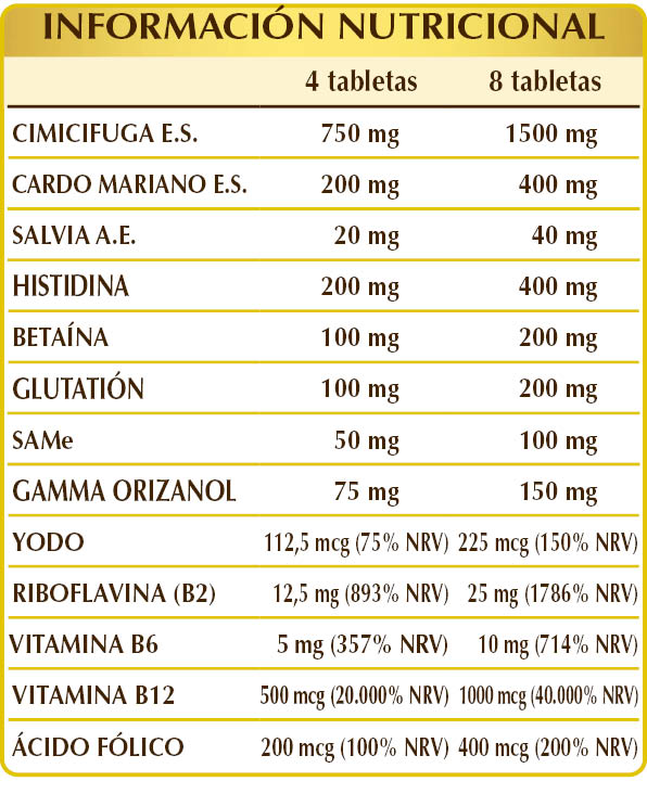 Cimicífuga (Cimicifuga racemosa) rizomas E.S. (titulado al 2,5% en glicósidos triterpénicos), celulosa microcristalina°, cardo mariano (Silybum marianum) semillas E.S. (titulado al 80% en silimarina), (L-)histidina, betaina, glutatión reducido, SAMe (S-adenosilmetionina disulfato tosilato), goma árabe°, fosfato de calcio dibásico°, gamma orizanol, vitamina B2 activada (riboflavina 5-fosfato de sodio), salvia (Salvia officinalis) hojas O.E., dióxido de silicio°°, estearato de magnesio de origen vegetal°°, vitamina B6 activada (piridoxal-5-fosfato), vitamina B12 activada (5-deoxiadenosilcobalamina, metilcobalamina), ácido fólico activado (L-metilfolato de calcio), yoduro de potasio. °Agente de carga °°Antiaglomerante