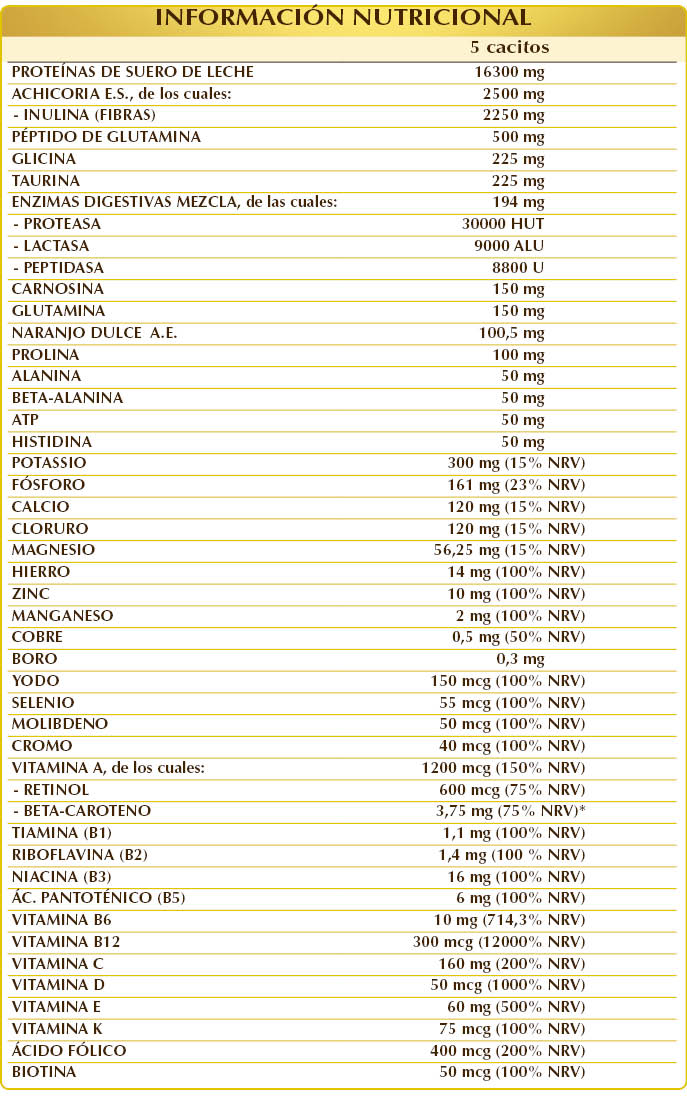 Proteínas de suero de leche, achicoria (Cichorium intybus) raíces E.S. (titulado al 90 % en inulina), fosfato de calcio glicerofosfato, péptido de glutamina, fosfato de magnesio glicerofosfato, citrato de potasio, cloruro de potasio, glicina, taurina, vitamina C (ácido ascórbico), (L-)carnosina, (L-)glutamina, vitamina E (acetato de DL-α-tocoferilo), gluconato de hierro, (L-)prolina; aroma natural: naranja dulce (Citrus aurantium var. sinensis o dulcis) corteza de los frutos A.E.; lactasa (100.000 ALU/g), gluconato de zinc, ATP (trifosfato de adenosina, sal sódica), (L-)alanina, beta-alanina, (L-)histidina, proteasa (500.000 HUT/g), peptidasa (200.000 U/g), dunaliella (Dunaliella salina) talo (alga) E.S. (titulado al 10 % en beta-caroteno), vitamina D3 (colecalciferol 100.000 UI/g), gluconato de manganeso, vitamina B3 (nicotinamida), vitamina B6 activada (piridoxal 5-fosfato); edulcorantes de origen natural: glucósidos de esteviol de stevia y taumatina; vitamina B5 (pantotenato de calcio), vitamina A (acetato de retinilo), gluconato de cobre, borato de sodio, vitamina B2 activada (riboflavina 5-fosfato de sodio), vitamina B1 (clorhidrato de tiamina), ácido fólico activado (L-metilfolato de calcio), picolinato de cromo, vitamina B12 activada (5-desoxiadenosilcobalamina, metilcobalamina), yoduro de potasio, molibdato de sodio, selenito de sodio, vitamina K1 (filoquinona), biotina.
