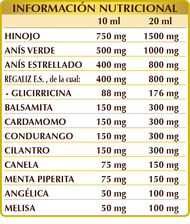 Glicerina vegetal bidestilada, agua pura, hinojo (Foeniculum vulgare) frutos E.I.L., anís verde (Pimpinella anisum) frutos E.I.L., anís estrellado (Illicium verum) frutos E.I.L., regaliz (Glycyrrhiza glabra) raíces E.S. (estandarizado al 18-22 % en ácido glicirrícico o glicirricina), balsamita (Chrysanthemum balsamita) hierba E.I.L., cardamomo (Elettaria cardamomum) semillas E.I.L., condurango (Marsdenia condurango) cortezas del árbol E.I.L., cilantro (Cinnamomum zeylanicum) frutos E.I.L., canela (Cinnamomum zeylanicum) cortezas E.I.L., menta piperita (Mentha piperita) hojas E.I.L., angélica (Angelica archangelica) raíces E.I.L., melisa (Melissa officinalis) hojas E.I.L.; edulcorantes de origen natural: glucósidos de esteviol, taumatina.