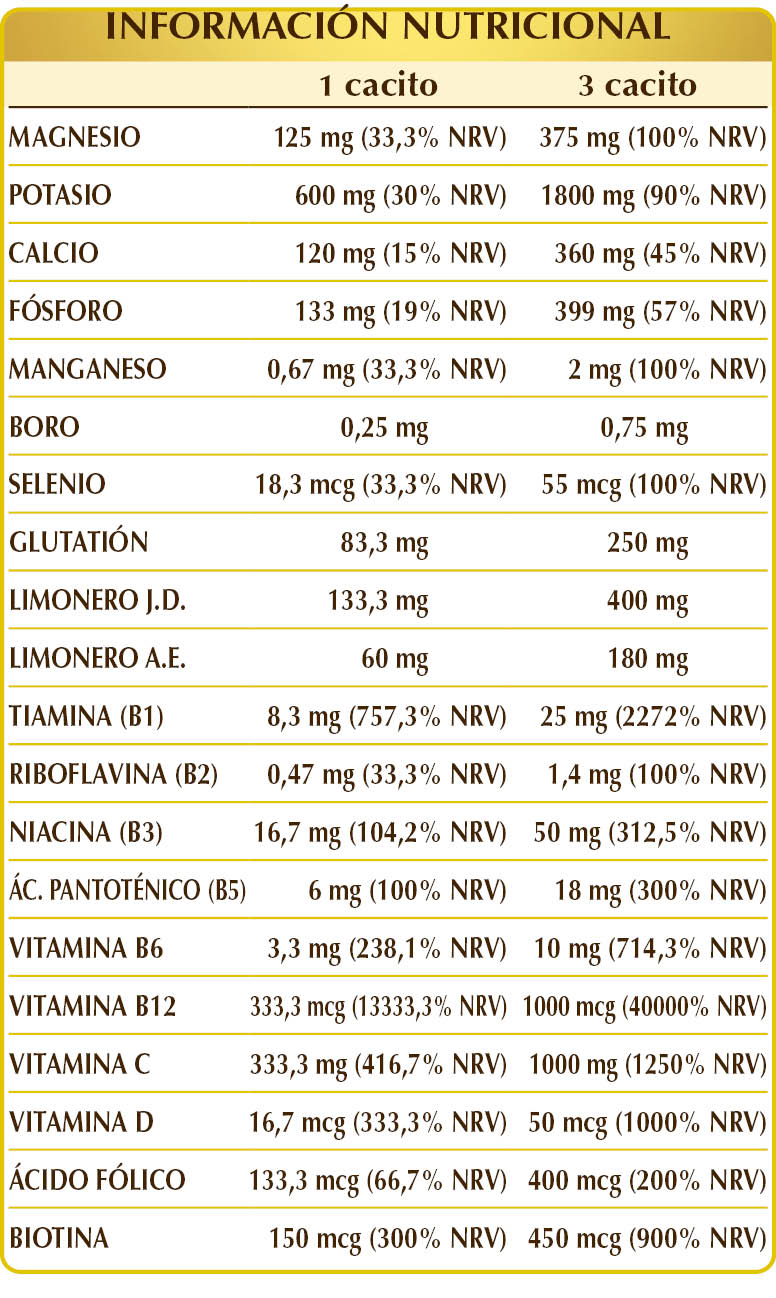 Maltodextrinas de maíz y arroz, citrato de potasio, citrato básico de magnesio, glicerofosfato de calcio, glicerofosfato de magnesio, vitamina C (ácido ascórbico), gluconato de magnesio, pidolato de magnesio, gluconato de potasio, limonero (Citrus limon) frutos J.D., glutatión reducido; aroma natural: limonero (Citrus limon) cáscaras de frutos A.E.; vitamina B3 (nicotinamida), vitamina B1 (clorhidrato de tiamina), vitamina B5 (pantotenato de calcio, liquen de los renos (Cladonia rangiferina) talo E.S. (titulado en vitamina D3 colecalciferol 100 000 UI/g), gluconato de manganeso, vitamina B6 activada (piridoxal 5-fosfato); edulcorantes de origen natural: glucósidos de esteviol de stevia, taumatina; borato de sodio, vitamina B2 activada (riboflavina 5-fosfato de sodio), vitamina B12 activada (5-desoxiadenosilcobalamina y metilcobalamina), biotina, ácido fólico activado (L-metilfolato de calcio), seleniato de sodio. E.S. = Extracto Seco