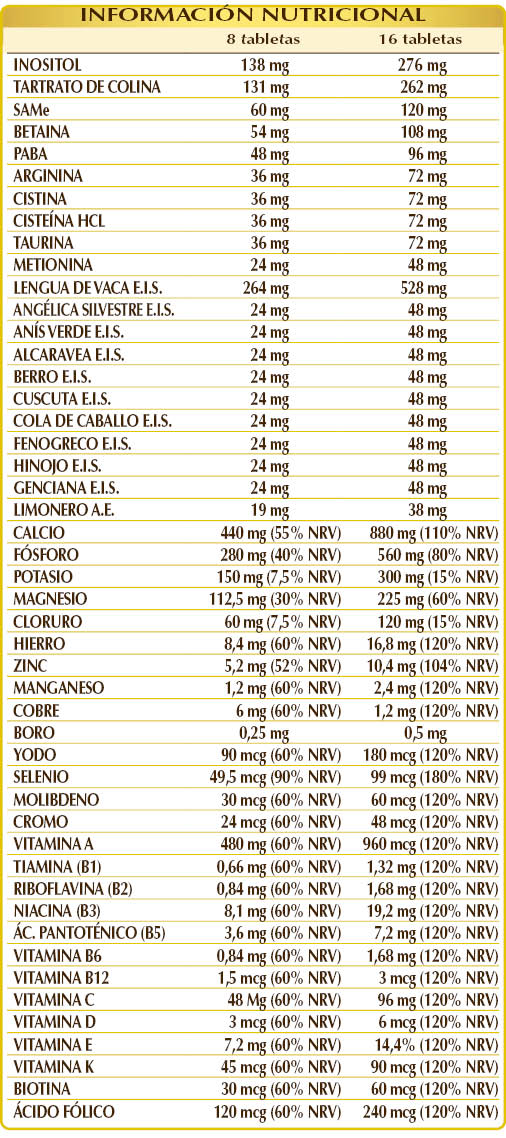 Fosfato cálcico dibásico, celulosa microcristalina°, fosfato cálcico tribásico, goma arábiga°, lengua de vaca (Rumex crispus) raíces E.I.S., dióxido de silicio°°, citrato de potasio, glicerofosfato de calcio, óxido de magnesio, mio-inositol de origen vegetal (extraído de semillas de maíz), tartrato de colina, cloruro de potasio, SAMe (S-adenosil metionina tosilato de disulfato), glicerofosfato de magnesio, gluconato de hierro, betaína, citrato de calcio, lactato cálcico, gluconato de calcio, PABA (ácido p-aminobenzoico), vitamina C (ácido L-ascórbico), gluconato de zinc, (L-)arginina, (L-)cistina, (L-)cisteína HCL o clorhidrato, taurina, (L-)metionina, angélica silvestre (Angelica sylvestris) raíces E.I.S., anís verde (Pimpinella anisum) frutos E.I.S., alcaravea (Carum carvi) frutos E.I.S., berro (Nasturtium officinale) hierba E.I.S., cuscuta (Cuscuta epithymum) hierba E.I.S., cola de caballo (Equisetum arvense) hierba E.I.S., fenogreco (Trigonella foenum-graecum) semillas E.I.S., hinojo (Foeniculum vulgare) frutos E.I.S., genciana (Gentiana lutea) raíces E.I.S., limonero (Citrus limon) cáscaras de los frutos A.E., vitamina E de origen vegetal (acetato de D-α-tocoferol), estearato de magnesio de origen vegetal°°, gluconato de manganeso, vitamina B3 (nicotinamida), borato de sodio, gluconato de cobre, vitamina B5 (pantotenato de calcio), vitamina A (acetato de retinol), vitamina B2 activada (riboflavina 5-fosfato de sodio),vitamina B6 activada (piridoxal-5-fosfato), liquen Cladonia rangiferina) tallo E.S. (estandarizado en vitamina D3 colecalciferol 100 000 UI/g), vitamina B1 (clorhidrato de tiamina), picolinato de cromo, ácido fólico activado (L-metilfolato de calcio), yoduro de potasio, selenito de sodio, molibdato de sodio, vitamina K1 (filoquinona), biotina, vitamina B12 activada (5-deoxiadenosilcobalamina, metilcobalamina). °Agente de carga. °°Antiaglomerante