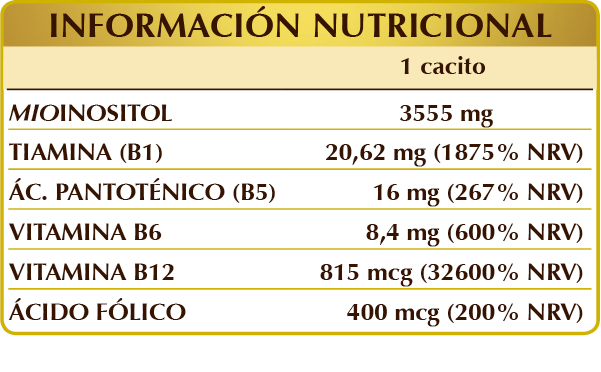 Mio-inositol de origen vegetal (extraído de semillas de maíz), maltodextrinas de maíz o arroz, vitamina B1 (clorhidrato de tiamina), vitamina B5 (pantotenato de calcio), vitamina B6 activada (piridoxal-5-fosfato), vitamina B12 activada (5-desoxiadenosilcobalamina, metilcobalamina), ácido fólico activado (L-metilfolato de calcio)..