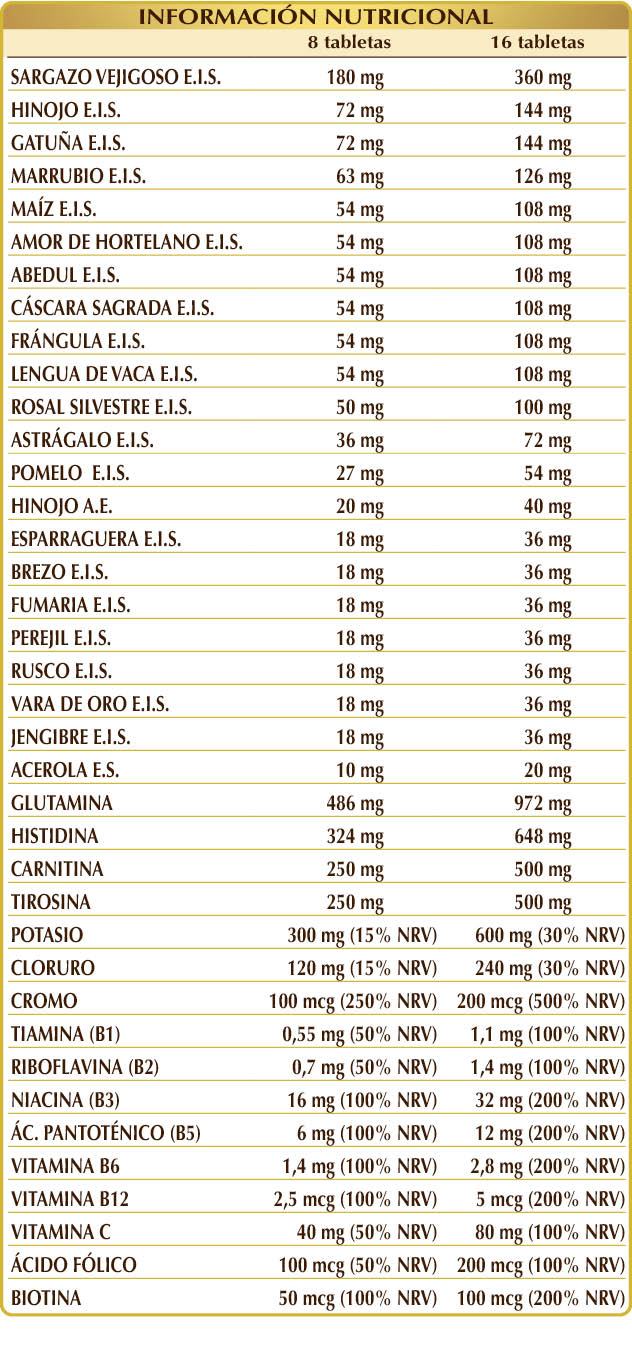(L-)glutamina, citrato de potasio, celulosa microcristalina°, goma arábiga°, (L-)histidina, cloruro de potasio, (L-)carnitina, (L-)tirosina (de fermentación), sargazo vejigoso (Fucus vesiculosus) talo (alga) E.I.S., dióxido de silicio°°, hinojo (Foeniculum vulgare) frutos E.I.S., gatuña (Ononis spinosa) raíces E.I.S., marrubio (Marrubium vulgare) hierba con flores E.I.S., amor de hortelano (Galium aparine) hierba con flores E.I.S., abedul blanco (Betula alba o pubescens) hojas E.I.S., cáscara sagrada (Rhamnus purshiana) cortezas E.I.S., frángula (Rhamnus frangula) cortezas E.I.S., maíz (Zea mays) estigmas E.I.S., lengua de vaca (Rumex crispus) raíces E.I.S., rosal silvestre (Rosa canina) frutos E.S. (titulado al 70 % en vitamina C), astrágalo (Astragalus membranaceus) raíces E.I.S., pomelo (Citrus paradisi) semillas E.I.S., hinojo (Foeniculum vulgare) frutos A.E., esparraguera (Asparagus officinalis) raíces E.I.S., brezo (Calluna vulgaris) hierba con flores E.I.S., fumaria (Fumaria officinalis) hierba con flores E.I.S., perejil (Petroselinum crispum) raíces E.I.S., rusco (Ruscus aculeatus) raíces E.I.S., vara de oro (Solidago virga-aurea) hierba con flores E.I.S., jengibre (Zingiber officinalis) rizomas E.I.S., vitamina B3 (nicotinamida), estearato de magnesio de origen vegetal°°, acerola (Malpighia glabra) frutos E.S. (titulado al 50% en vitamina C), vitamina B5 (pantotenato de calcio), vitamina B6 activada (piridoxal-5-fosfato), vitamina B2 activada (riboflavina 5-fosfato de sodio), cromo picolinato, vitamina B1 (clorhidrato de tiamina), ácido fólico activado (L-metilfolato de calcio), biotina, vitamina B12 activada (5-desoxiadenosilcobalamina, metilcobalamina). °Agente de carga °°Antiaglomerante