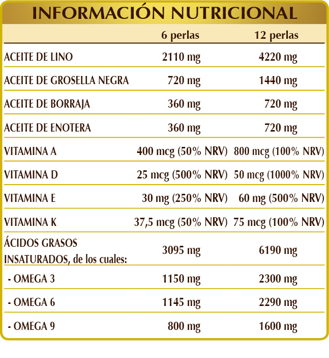 Lino (Linum usitatissimum) aceite de semillas, grosellero negro (Ribes nigrum) aceite de semillas, borraja (Borago officinalis) aceite de semillas, enotera (Oenothera biennis) aceite de semillas, vitamina E de origen natural (D-α-tocoferol), vitamina A (palmitato de retinol), vitamina K1 (filoquinina), vitamina D3 (colecalciferol); excipientes (perlas): gelatina alimentaria y glicerina.