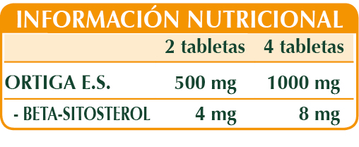 Ortiga (Urtica dioica) raíces E.S. (titulado al 0,8 % en beta-sitosteroles), maltodextrinas de maíz o arroz, celulosa microcristalina°, goma arábiga°, dióxido de silicio°°, estearato de magnesio de origen vegetal°°.