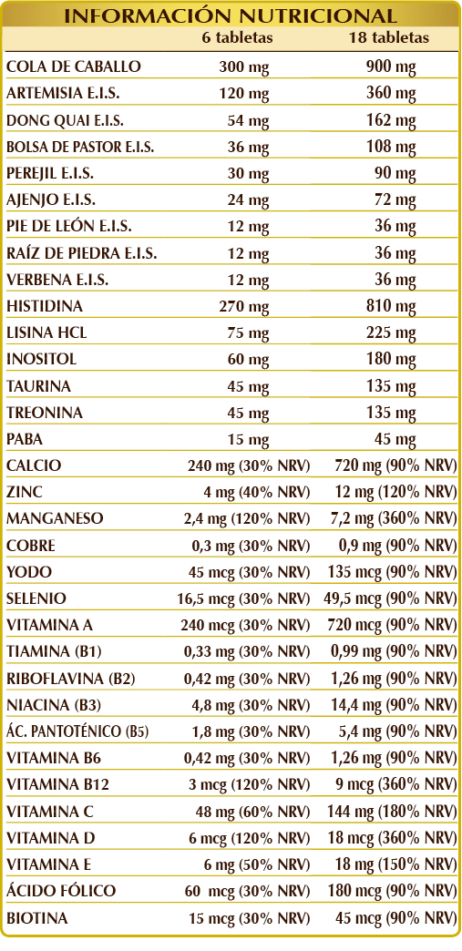 Lactato cálcico, cola de caballo (Equisetum arvense) hierba polvo, (L-)histidina, fosfato cálcico dibásico, celulosa microcristalina°, goma arábiga°, artemisa (Artemisia vulgaris) hierba con flores E.I.S., carbonato cálcico, (L-)lisina HCL o clorhidrato, mio-inositol de origen vegetal (extraído de semillas de maíz), dong quai (Angelica sinensis) raíces E.I.S., vitamina C (ácido ascórbico), taurina, (L-)treonina, bolsa de pastor (Capsella bursa-pastoris) hierba E.I.S., dióxido de silicio°°, gluconato de zinc, perejil (Petroselinum crispum) frutos E.I.S., ajenjo (Artemisia absinthium) hierba con flores E.I.S., gluconato de manganeso, PABA (ácido p-aminobenzoico), vitamina E de origen vegetal (acetato de D-α-tocoferol), estearato de magnesio de origen vegetal°°, pie de león (Alchemilla vulgaris) hierba E.I.S., raíz de piedra (Collinsonia canadensis) raíces E.I.S., verbena (Verbena officinalis) hierba con flores E.I.S., vitamina B3 (niacina), liquen Cladonia rangiferina) tallo E.S. (titulado al 50% en Vitamina D3 colecalciferol 100.000 UI/g), gluconato de cobre, vitamina B5 (pantotenato de calcio), vitamina A (acetato de retinilo), vitamina B2 activada (riboflavina 5-fosfato de sodio), vitamina B6 activada (piridoxal-5-fosfato), vitamina B1 (clorhidrato de tiamina), ácido fólico activado (L-metilfolato de calcio), yoduro de potasio, selenito de sodio, biotina, vitamina B12 activada (5-deoxiadenosilcobalamina, metilcobalamina). E.S. = Extracto Seco °Agente de carga °°Antiaglomerante