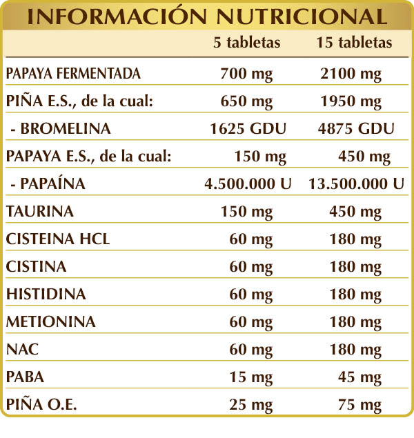 Frutos fermentados de papaya (Carica papaya), tallos de frutos de piña (Ananas comosus) E.S. (bromelina 2500 GDU/g), goma arábiga°, cellulosa microcristallina°papaya (Carica papaya) frutos E.S. (papaína 30.000 U/mg), taurina, (L-)cisteína HCL o clorhidrato, (L-)cistina, (L-)histidina, (L-)metionina, NAC (N-acetilcisteína), PABA (p- ácido aminobenzoico), dióxido de silicio°°, A.E. de frutos de hinojo (Foeniculum vulgare), estearato de magnesio de origen vegetal°°. °Agente de carga. °°Antiaglomerante.