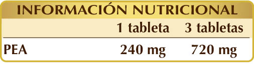 Complemento de palmitoiletanolamida (PEA), una molécula producida naturalmente por nuestro organismo a partir de un ácido graso, el ácido palmítico, y también presente en pequeñas cantidades en algunos alimentos. Su síntesis disminuye con la edad y su integración puede resultar útil.