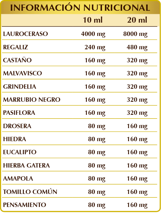 Glicerina vegetal bidestilada, agua pura, lauroceraso (Prunus laurocerasus) hojas frescas E.I.L., regaliz (Glycyrrhiza glabra) raíces E.I.L., castaño (Castanea vesca o sativa) hojas E.I.L., malvavisco (Althaea officinalis) raíces E.I.L., grindelia (Grindelia robusta) hierba con flores E.I.L., marrubio negro (Ballota nigra sub. foetida) hierba con flores E.I.L., pasiflora (Passiflora incarnata) hierba con flores E.I.L., drosera (Drosera ramentacea) hierba E.I.L., hiedra (Hedera helix) hojas E.I.L., eucalipto (Eucalyptus globulus) hojas E.I.L., hierba gatera (Nepeta cataria) hierba con flores E.I.L., amapola (Papaver rhoeas) flores E.I.L., tomillo común (Thymus vulgaris) hojas E.I.L., pensamiento (Viola tricolor) hierba con flores E.I.L.; edulcorantes de origen natural: glucósidos de esteviol (estevia), taumatina. Con edulcorantes de origen natural.